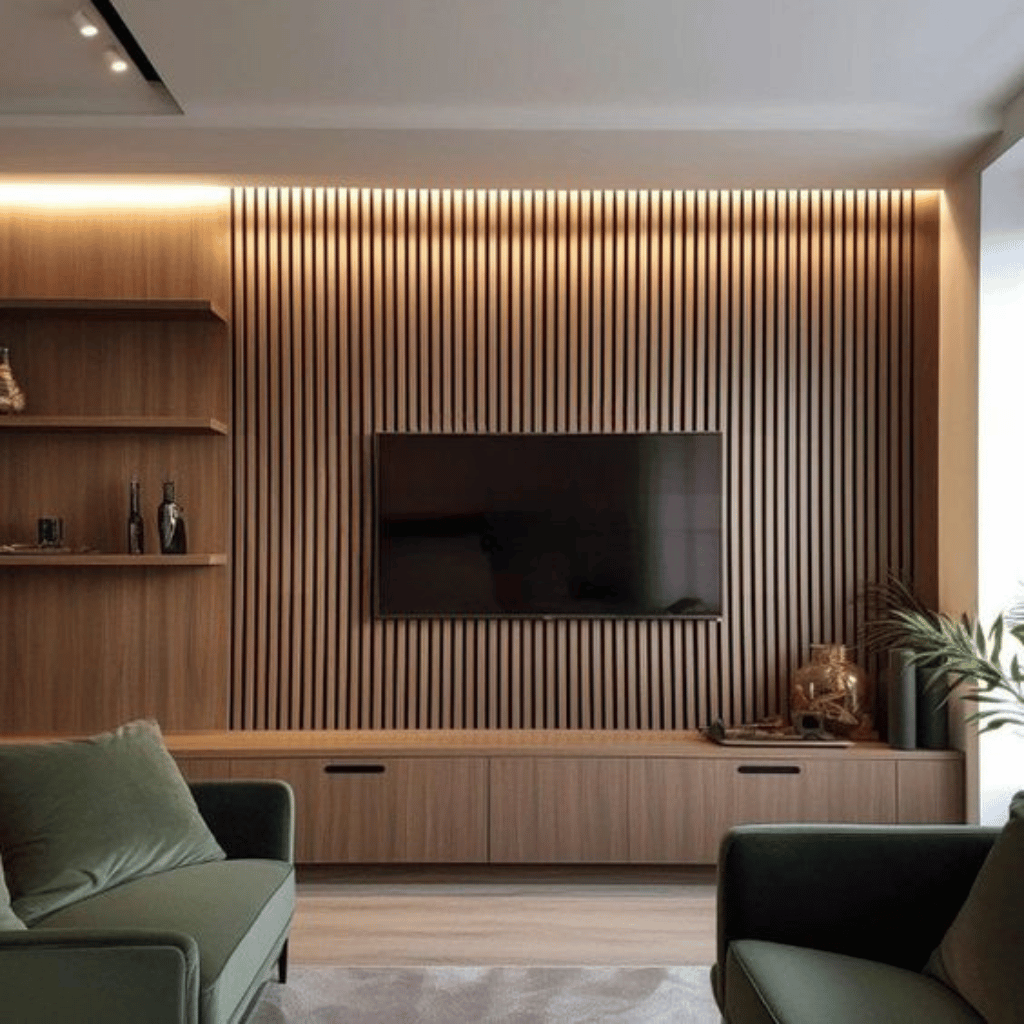Le style apporte une touche moderne et élégante à la pièce, en contraste avec le mobilier et l’éclairage.